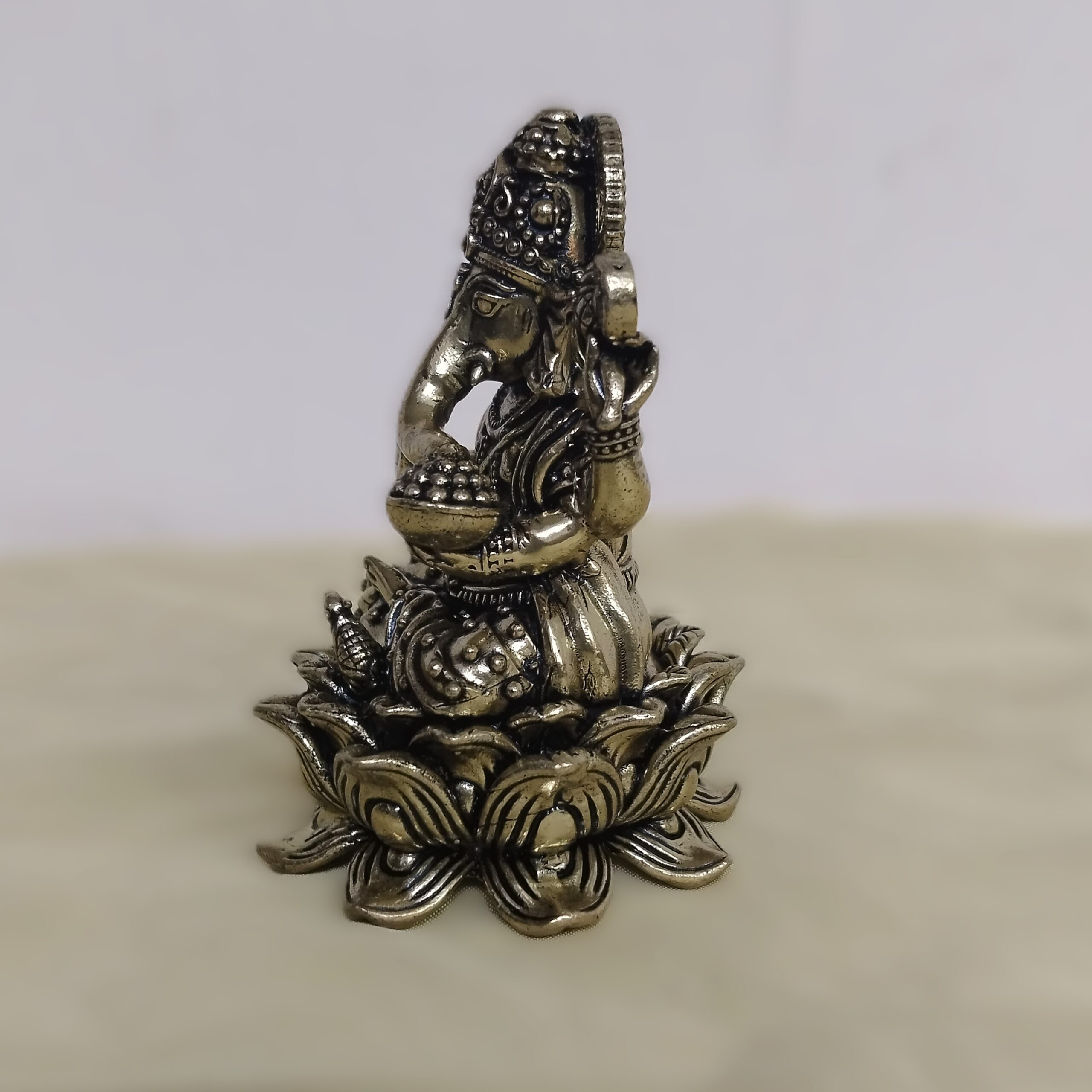 Bring home the divine blessings of Lord Ganesha with this handcrafted antique brass idol. Standing at 3.15 inches in height, this idol is intricately detailed by skilled artisans and finished with an elegant antique polish. Lord Ganesha, known as the remover of obstacles and the harbinger of wisdom, makes this piece perfect for pooja rooms, living spaces, or as a thoughtful gift for special occasions.