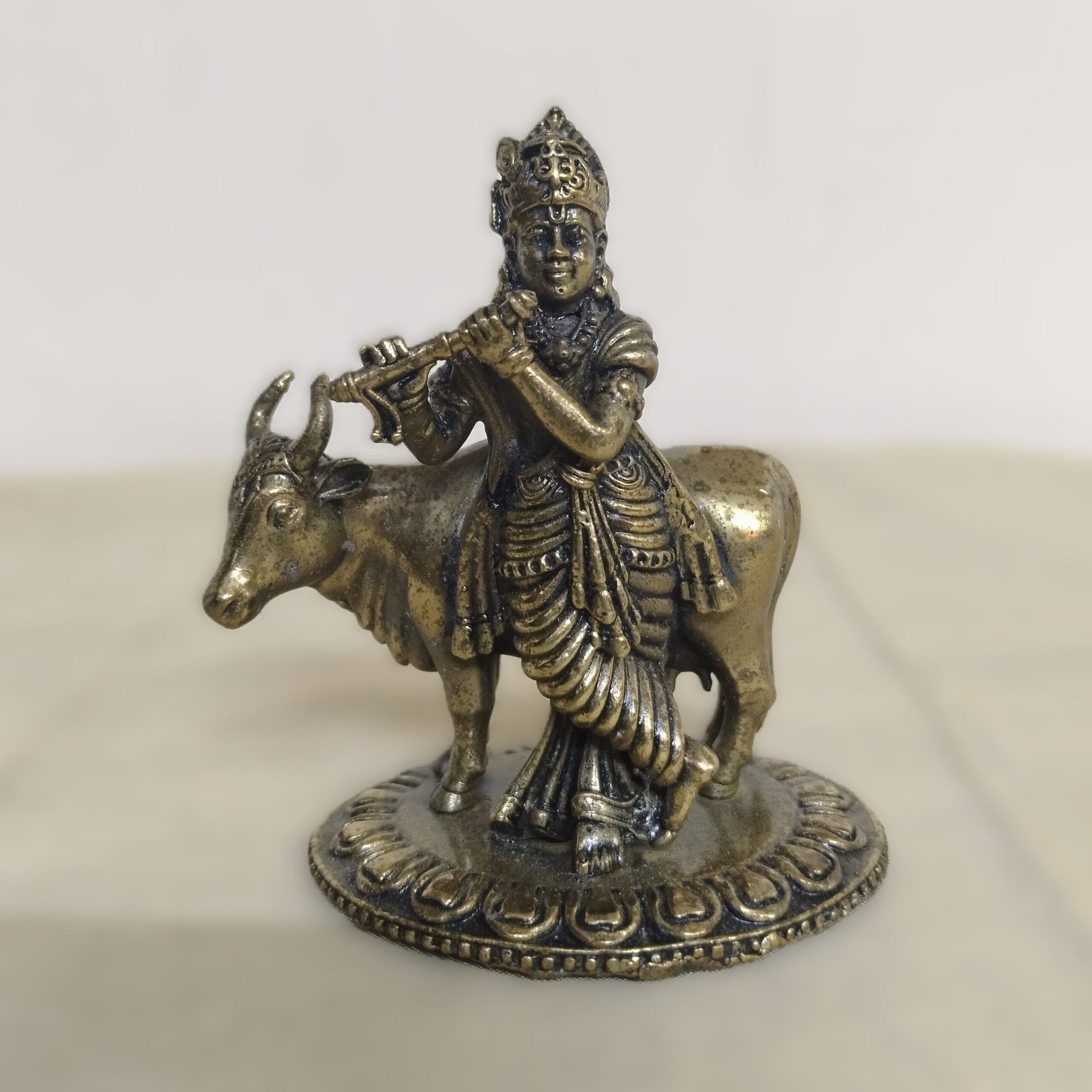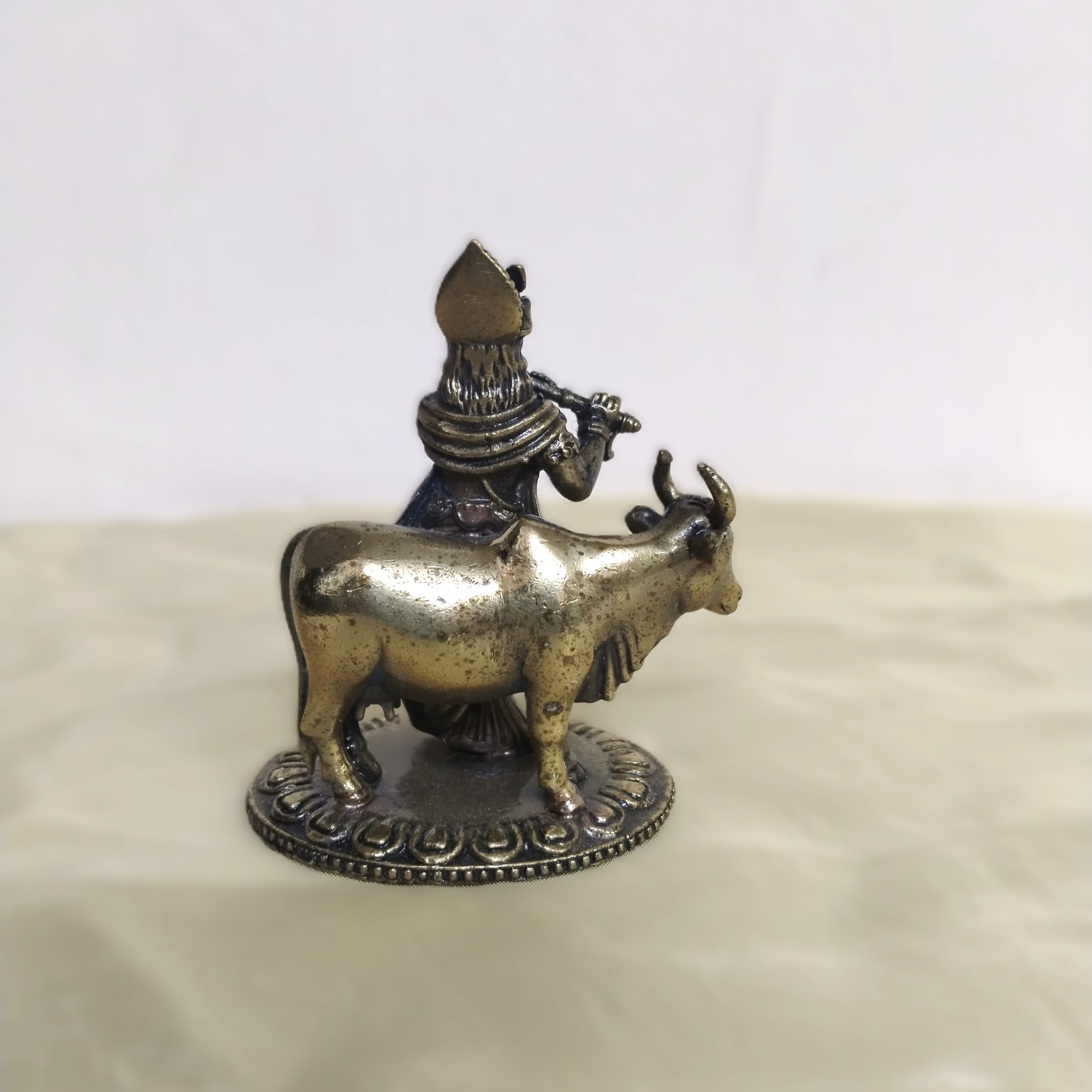 Bring home the divine charm of Lord Krishna with this handcrafted antique brass statue featuring Krishna with a cow. Standing 3 inches tall, this exquisite idol captures the essence of Krishna’s childhood and his eternal bond with nature and animals.